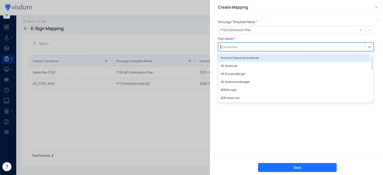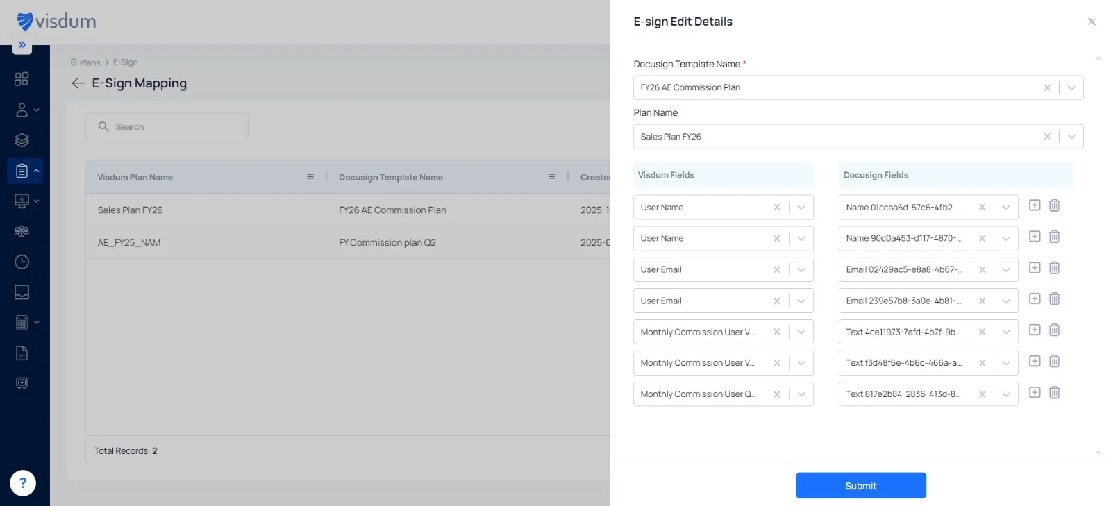 Match the relevant Visdum fields (e.g., rep name, commission amount, plan name) with their corresponding DocuSign fields to ensure accurate data transfer.