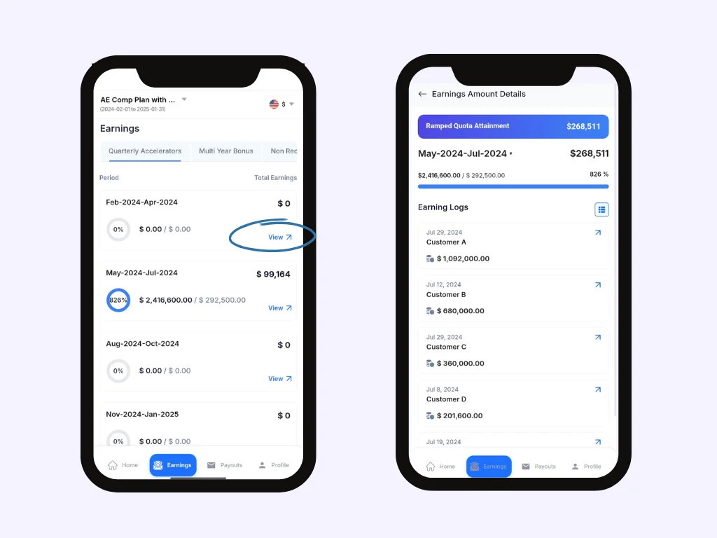 It’s a quick way to see which parts of your plan are contributing most to your overall earnings. You can tap “View” to open a detailed breakdown of each component, making it easy to track progress, understand payout calculations, and stay aligned with your targets.