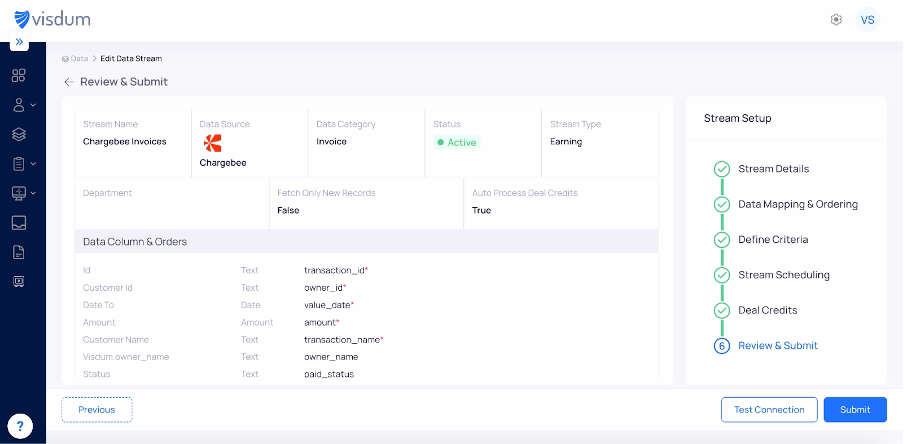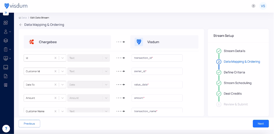 3. Map fields from Chargebee (invoice ID, customer ID, payment date, amount, status) to the corresponding Visdum fields so your commission engine interprets the data correctly.