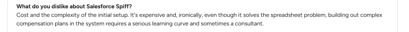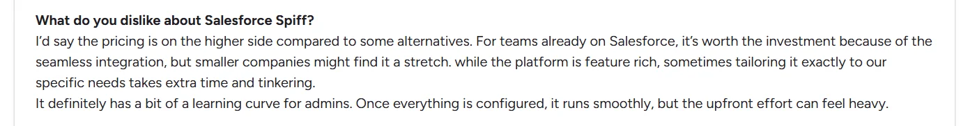 From what we have also heard directly from customers who switched - Spiff pricing often feels too high for the value it delivers, especially after the Salesforce acquisition. Users on G2 and Reddit consistently describe the same. While Spiff offers robust features, its pricing and implementation now cater more to large enterprises than scaling teams.