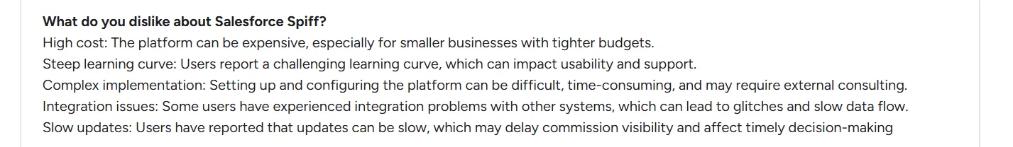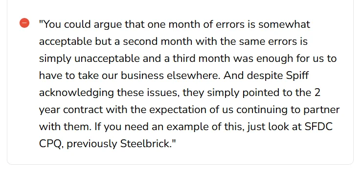 And because Spiff now lives deeper inside Salesforce’s product suite, customers who aren’t on Salesforce often feel like second-tier users. This frustration isn’t limited to pricing alone. Post-acquisition platform changes have also increased operational risk and overhead for customers.